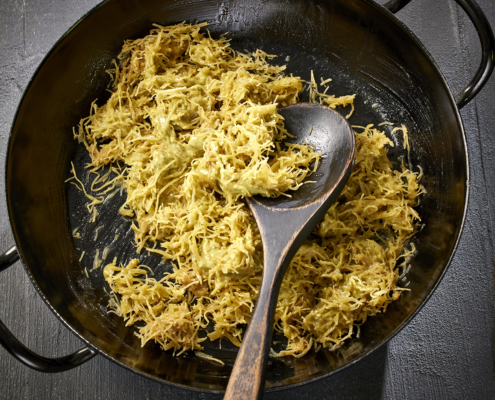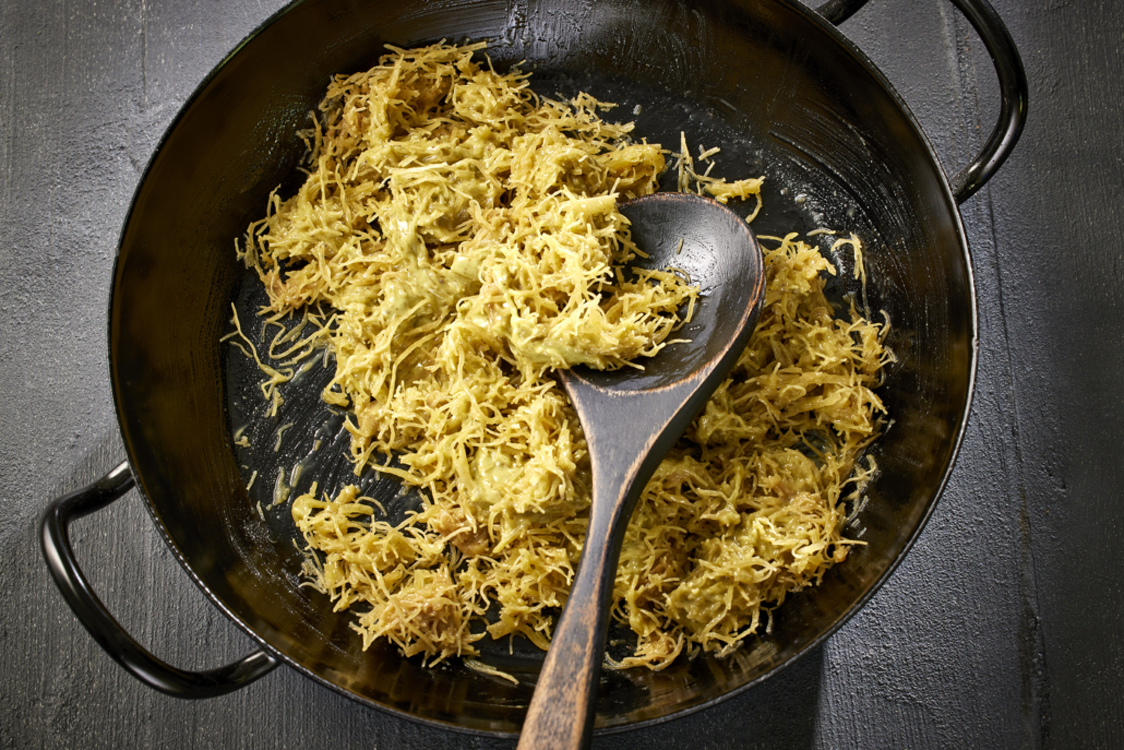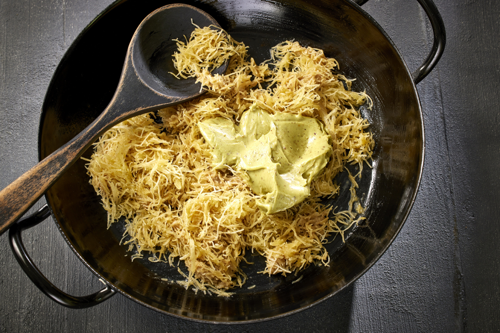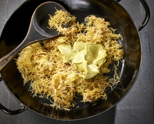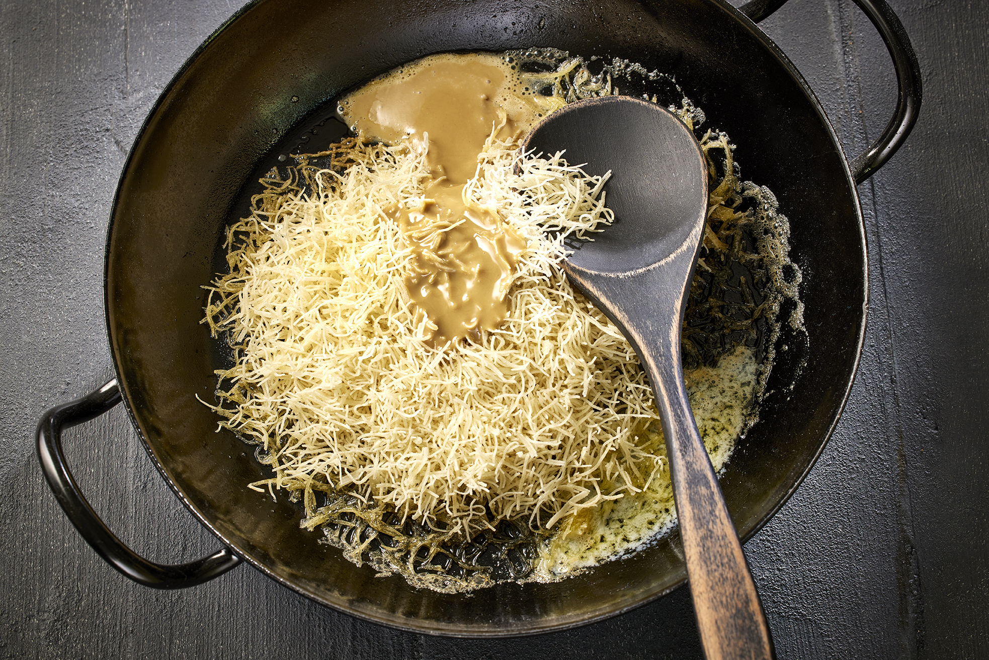 Und dann heißt es: Kadayif mit Butter und Tahin in der Pfanne rösten, mit Wunschpaste aromatisieren und zuletzt mit der geschmolzenen Lieblingsschokolade in eure Formen schichten.