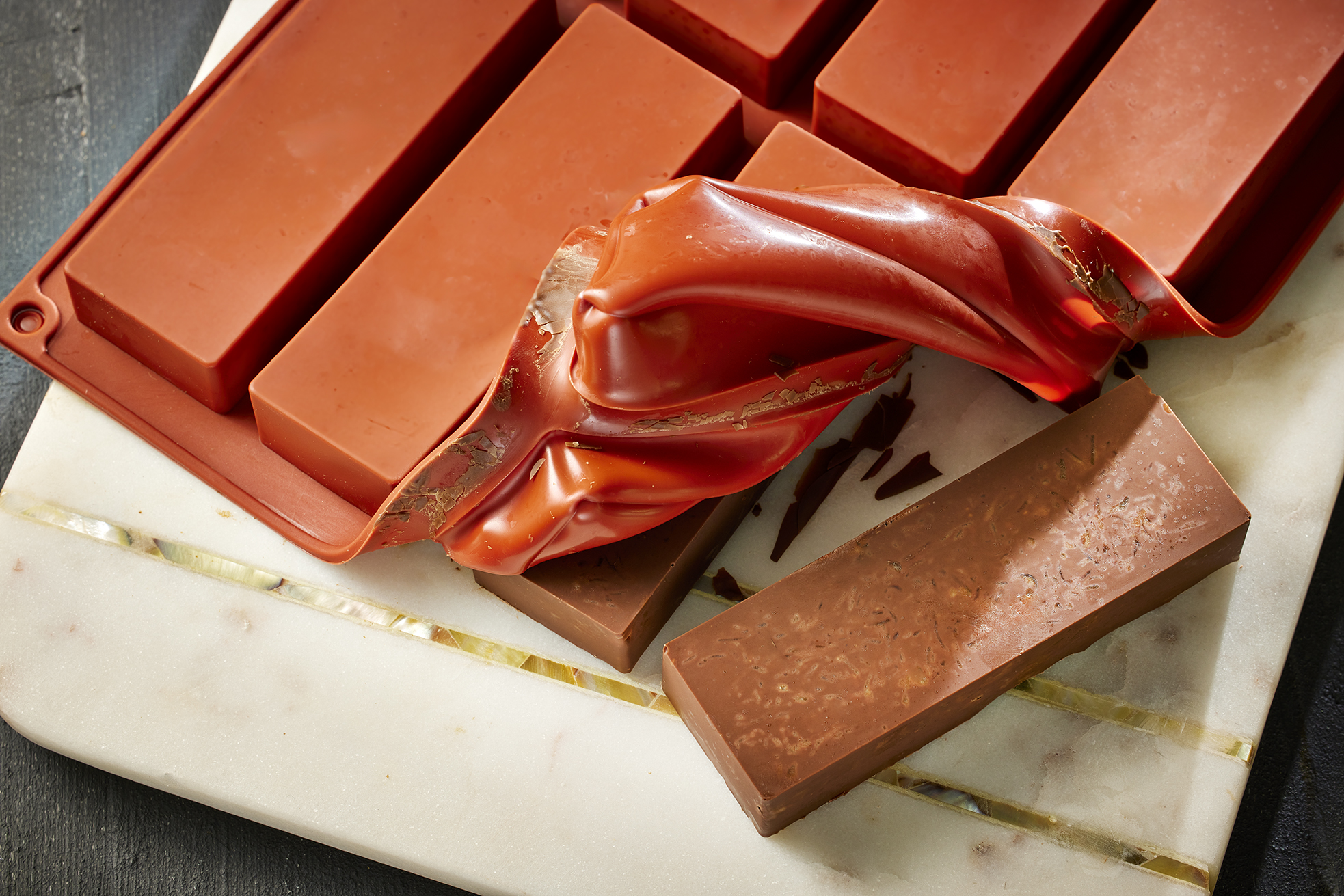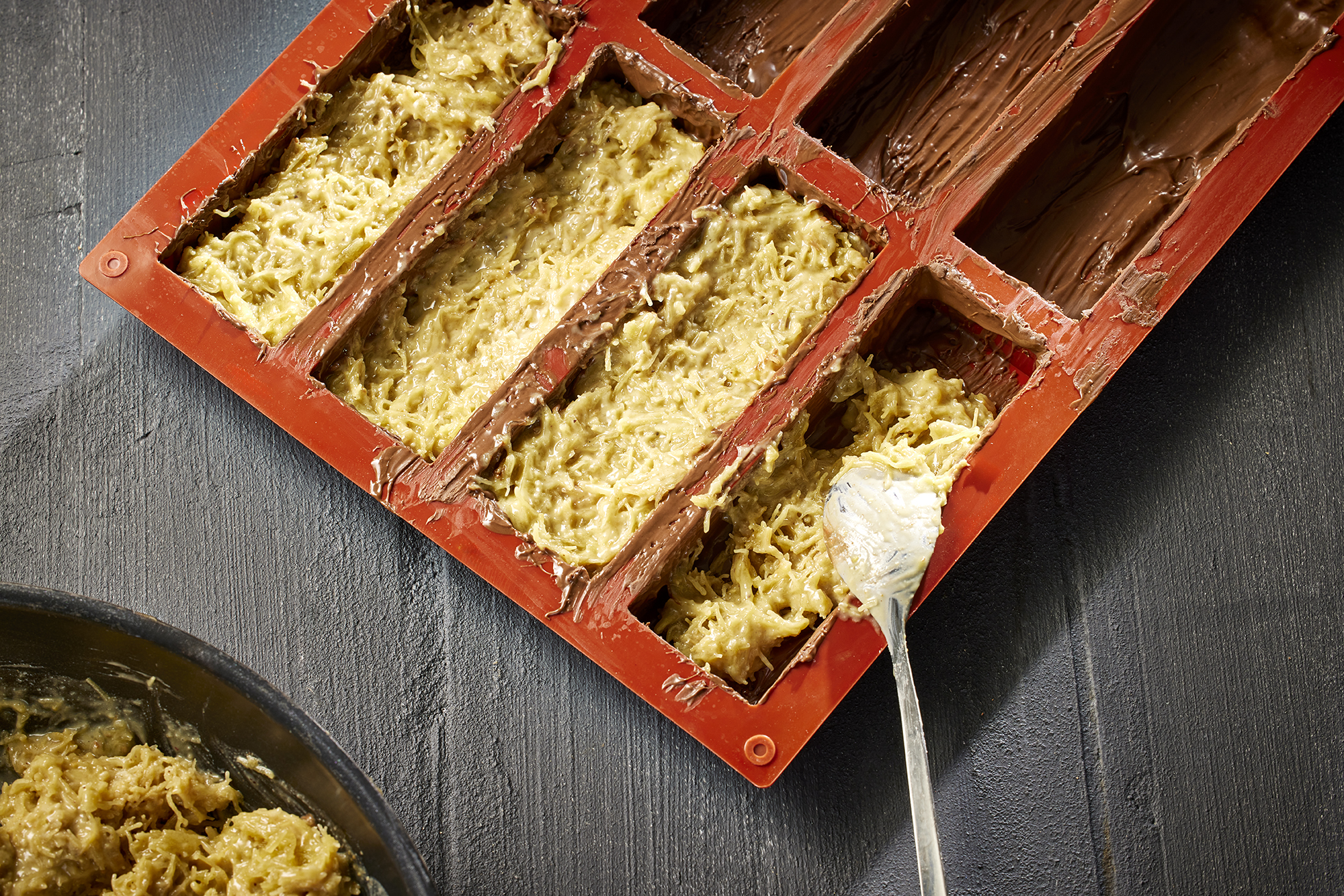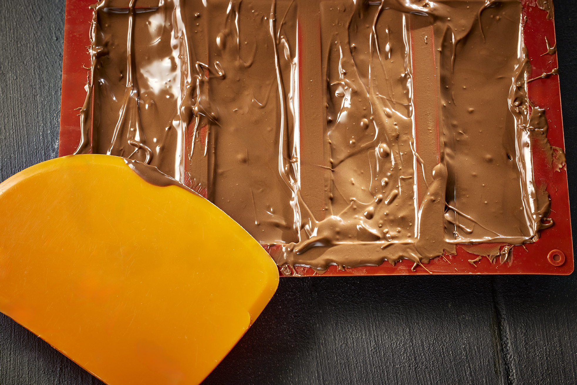 5. Boden und Ränder der Silikonform mit Kuvertüre einstreichen.